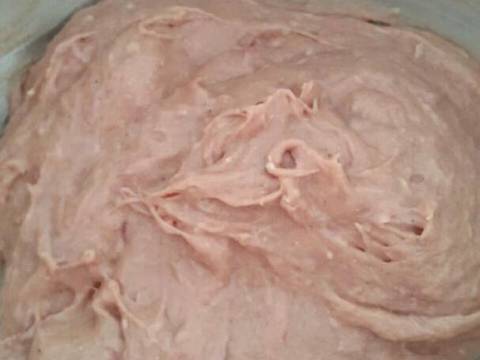 - Haluskan daging bersama es batu dalam food processor. Begini hasilnya. Bisa dilihat warna daging berbeda ya. Daging dibagian bawah nampak sedikit lebih gelap warnanya dibanding daging paling atas yg baru digiling. Memang begitu dikeluarkan dr food processor segera warna daging berubah. Oleh sebab itu perlu dicampurkan es batu utk menjaga kesegaran daging